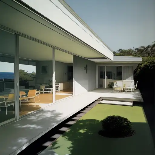 almost 2 years ago Hyper realistic eye level exterior photo of a mid century modern style house overlooking the ocean, daylight, indirect lighting, AD magazine, Frank Lloyd, Eames, Mies van der Rohe Mandrake 0 53