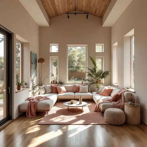 7 months ago High resolution photography interior design, dreamy sunken living room conversation pit, wooden floor, small windows opening onto the garden, bauhaus furniture and decoration, high ceiling, beige blue salmon pastel palette, interior design magazine, cozy atmosphere; 8k, intricate detail, photorealistic, realistic light, wide angle, kinkfolk photography, A+D architecture Mandrake 0 48