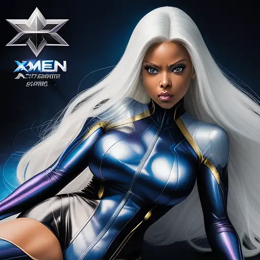 over 1 year ago Comic Cover with the Marvel Book Title "X-MEN" at the top. gorgeous superheroine Storm X-men (Benes Studio) Artgerm style, Storm, low-cut top glossy fabric, tight fitting costume, stretch fabric thigh high leg boots, white hair, bright eyes, X-men logo on costume, close-up portrait, character reclining, gorgeous, very elegant, fantasy character art, comic book art Mandrake 0 47