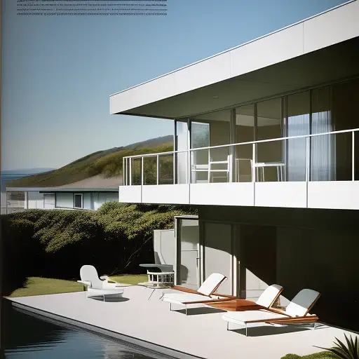 2 years ago Hyper realistic eye level exterior photo of a mid century modern style house overlooking the ocean, daylight, indirect lighting, AD magazine, Frank Lloyd, Eames, Mies van der Rohe MarkCreator 1 43