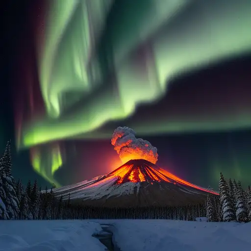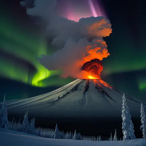 2 years ago hiper realistic photo of volcano erupting, in snowy northern landscape, aurora borealis, wide image, two snowy pine trees in the foreground Missael666 0 66