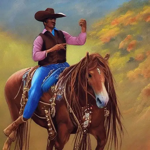 2 years ago realistic image of a skilled vaquero, a Mexican cowboy with a brown skin , in a dynamic pose. He should be wearing traditional vaquero attire, including a wide-brimmed sombrero, a serape (a colorful Mexican blanket worn over the shoulders), leather chaps, and riding boots. The vaquero should be riding a powerful and majestic horse, both in motion. The horse can be adorned with traditional Mexican horse tack, such as a beautifully decorated saddle and bridle. In the vaquero's hand, place a carefully detailed revolver, symbolizing his expertise with firearms. It should be a classic Western-style revolver, with engraved details and a wooden grip. Mexican landscape in the background, such as desert scenery or distant mountains. Missael666 0 25