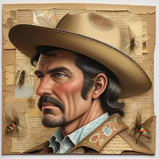 2 years ago Very finely detailed 2-dimensional papar collage, featuring the face of a weatherworm western cowboy, close-up, The papers used to créate this collage are vintage and colorful, each piece shaped like an insect Missael666 1 100
