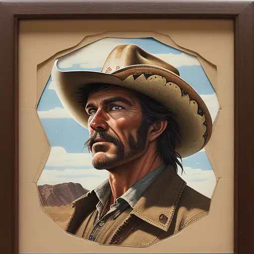 2 years ago Very finely detailed 2-dimensional papar collage, featuring the face of a weatherworm western cowboy, close-up, Missael666 0 40
