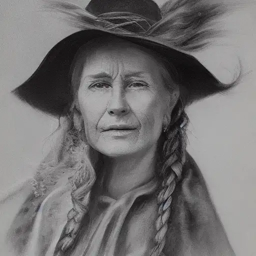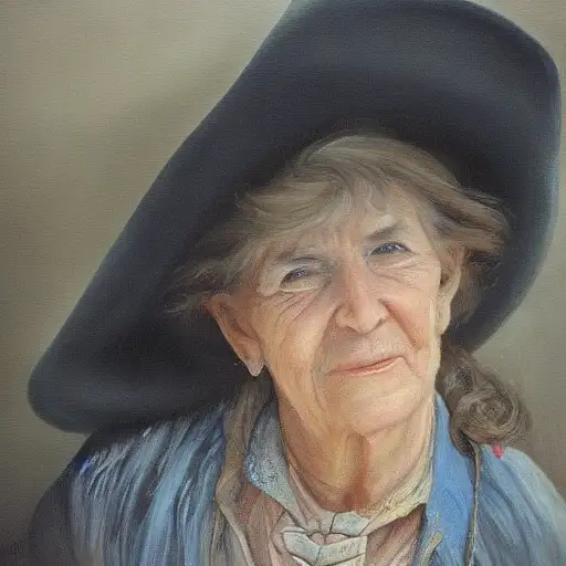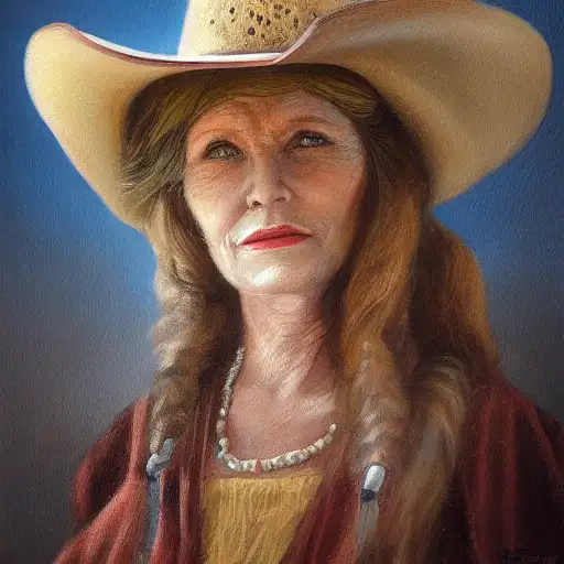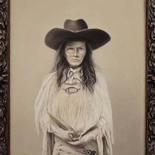 over 2 years ago High resolution photography of a ultra realistican old cowgirl in 19th century, beautiful painting with highly detailed face by tim cox, with a wide cowboy hat, which gives him a mysterious and so gloomy, he wears a long cape and poncho , which gives him an air of a lonely and carefree protagonist, Beneath the cloak he wears a white shirt and a dark brown vest, which is often covered in dust and worn due to the arid conditions of the environment, he also wears a wide belt and a pair of revolvers crossed at the waist, highlighting his role as a bounty hunter and his skill with weapons, His calm and confident demeanor, combined with his scruffy yet elegant appearance, creates an iconic and recognizable cowboy Missael666 0 65