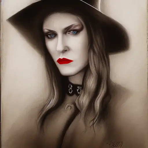 over 2 years ago a drawing of a pale female with straight ginger hair hazel eyes, a serious expression, and red lipstick in the style of wildwest gothic, western-style portraits, sharp focus, moody lighting, realistic figures, wearing a black cowboy hat Missael666 0 44