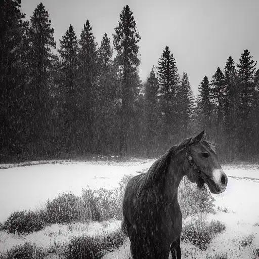 over 2 years ago a horse, whistling, in the rain, wearing a steetson hat, surrounded by pine trees, looking sad, arriving home, snowy landscape.realistic light, wide angle, kinkfolk photography, A+D architecture Missael666 0 51