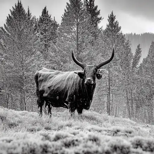 over 2 years ago an old longhorn cattle bull, in the rain, surrounded by snowy pine trees, looking sad, head down, colored in black and white, coming home, snowy landscape, realistic light, wide angle, kinkfolk photography, A+D architecture Missael666 0 63