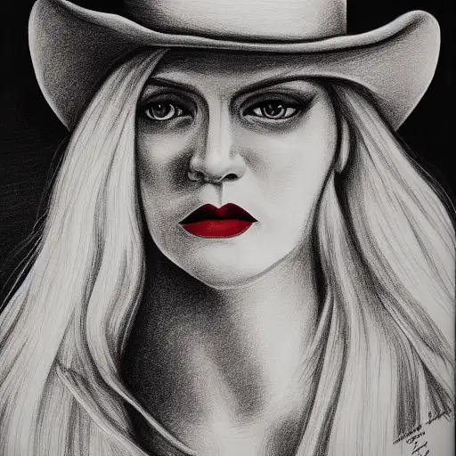 over 2 years ago **a drawing of a pale female with straight ginger hair hazel eyes, a serious expression, and red lipstick in the style of wildwest gothic, western-style portraits, sharp focus, moody lighting, realistic figures, wearing a white cowboy hat. Missael666 0 56
