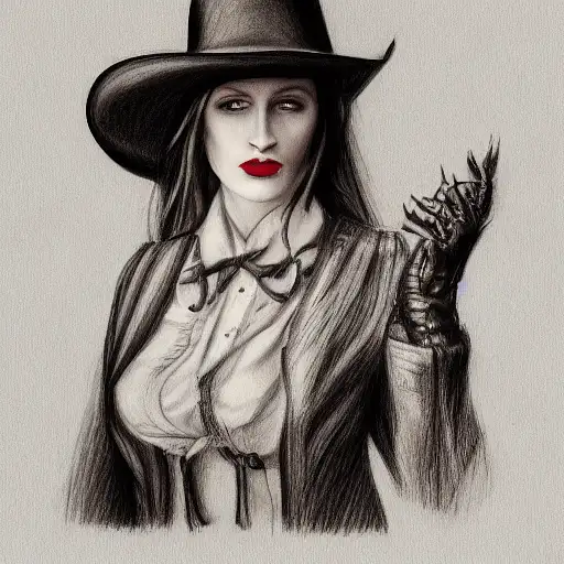 over 2 years ago **a drawing of a pale female with straight ginger hair hazel eyes, a serious expression, and red lipstick in the style of wildwest gothic, western-style portraits, sharp focus, moody lighting, realistic figures, wearing a white cowboy hat. Missael666 0 52