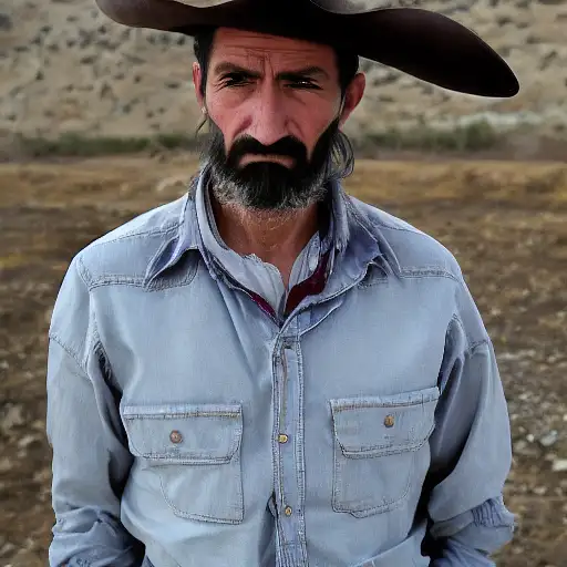 over 2 years ago High resolution photography of a ultra realistican old cowboy in 19th century, beautiful painting with highly detailed face by tim cox, with a wide cowboy hat, which gives him a mysterious and so gloomy, he wears a long cape and poncho , which gives him an air of a lonely and carefree protagonist, Beneath the cloak he wears a white shirt and a dark brown vest, which is often covered in dust and worn due to the arid conditions of the environment, he also wears a wide belt and a pair of revolvers crossed at the waist, highlighting his role as a bounty hunter and his skill with weapons, His calm and confident demeanor, combined with his scruffy yet elegant appearance, creates an iconic and recognizable cowboy Missael666 0 60