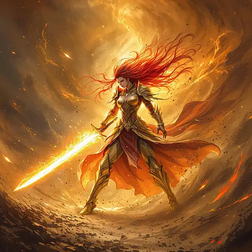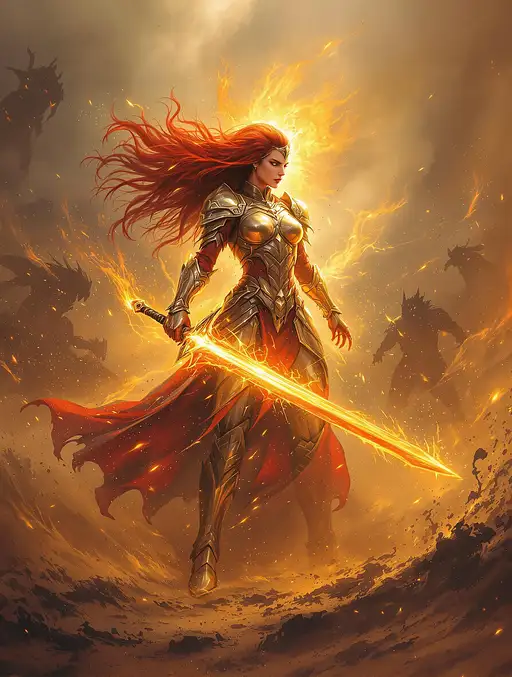 5 months ago A wide, long-shot view of an epic battleground, with a warrior princess at the exact center, wielding an unusually strong, glowing sword. She stands amidst a swirling storm of dust and dirt, her ink-like metallic armor gleaming with gold and crimson. The glowing sword emits radiant energy, cutting through the chaos as she fights off evil creatures surrounding her. Her fiery, ink-streaked hair flows dramatically, blending with the alcohol ink hues of orange, red, and brown that dominate the surreal environment. The storm amplifies the intensity of the scene, while smoky air and scattered silhouettes of clashing enemies frame her as the focal point in a breathtaking masterpiece of epic fantasy. MistaShah 0 32