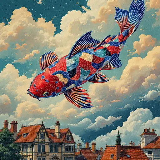 18 days ago Prompt: A giant koi fish swims gracefully across the sky as if it were water, its shimmering scales stitched in intricate threads of ruby, emerald, and sapphire. Below, rooftops glimmer with reflected colors. Rendered in embroidered textile style with rich textures, layered patterns, and a surreal, dreamlike mood.in the style of Needlepoint --v 6 Morgue PRO 0 14