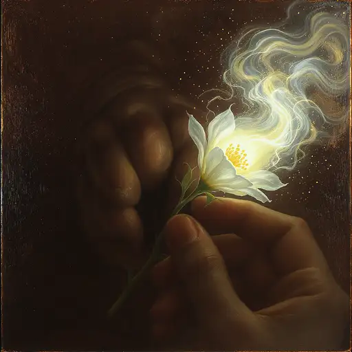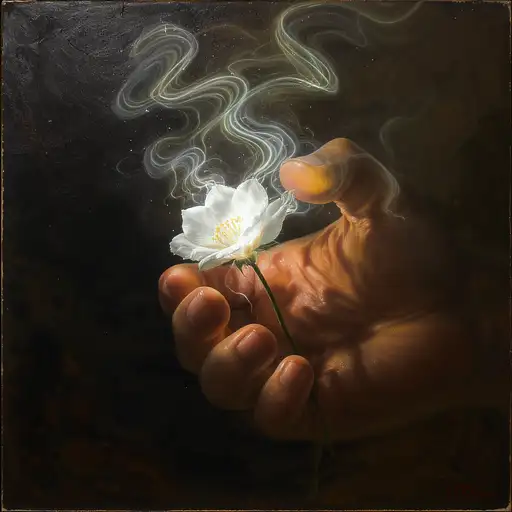 30 days ago A delicate flower being crushed by a strong hand or heavy force, yet its fragrance rises in luminous, ethereal waves of light and color, filling the air. The contrast between brutal strength and fragile beauty, depicted in poetic symbolism. Oil painting with visible brushstrokes, high detail, dramatic lighting, cinematic atmosphere. Morgue PRO 0 28