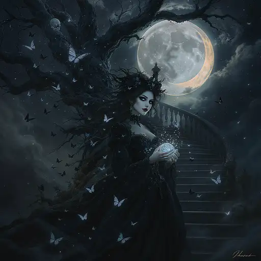 1 month ago Masterpiece digital painting, dark Gothic atmosphere, 8K, ultra HD, (((the Butterfly girl))), victorian gothic style, beautiful face with haunting elegance, ((details of death night)). Visualize a (((mysterious girl))) standing by an (((aged and weathered tree))), while ethereal black butterflies flutter around her, wings shimmering with spectral light. She holds in her hands a glowing cursed sphere, her curly drill hairstyle inspired by Tim Burton, and wears a long gothic gown made of black velvet and translucent lace. Behind her rises a grand, crumbling staircase, spiraling into the night mist. In the sky above, a massive, hyperrealistically detailed full moon glows, eclipsed in the shape of a surreal skull crescent, casting an eerie light upon the scene. Swirling nightmares fill the background, echoing the beauty and melancholy of her gaze. Morgue PRO 0 17
