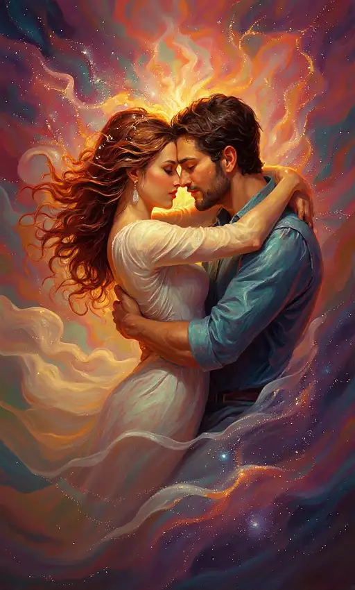 26 days ago Epic oil painting of two lovers colliding in passion, bodies intertwined, lips almost touching, surrounded by cosmic fire and stardust. Textures like sculpted oil paint, impasto with dramatic highlights and shadows, sensual energy radiating from their embrace. Vivid colors — deep crimson, glowing gold, violet, turquoise — evoking both fire and the universe exploding. Classical oil painting style with modern surreal intensity.” Morgue PRO 0 15