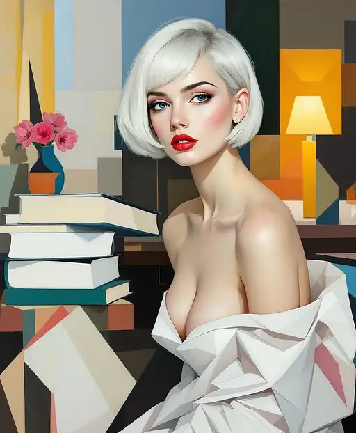 25 days ago "Cubist painting of a young woman with short white hair and striking blue eyes, porcelain skin, elegant makeup with red lips. She wears a flowing white gown reimagined through angular planes and geometric abstraction. In the background, cubist romantic objects appear: fragmented books stacked on a tilted table, a stylized vase with abstract flowers, and a glowing lamp reduced to angular light shapes. The scenery is dreamlike, with overlapping perspectives, warm soft tones contrasting with cool whites and blues. Painted with textured brushstrokes, geometric fragmentation, avant-garde cubist style inspired by Picasso and Juan Gris, artistic and poetic atmosphere."painting by Pablo Picasso --niji 6 Morgue PRO 0 10