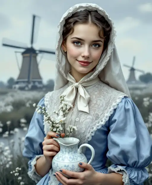 Masterpiece art, colorful mineral chinece Ink and pen craft rice paper Waltercolor, ink and pen, alcohol wash, dreamlike, pastels, Water carrier with a copper bucket at the fountain art by Kinuko Y. Craft, Frederick Carl Frieseke, Frances MacDonald, Ferris Plock, John Hejduk, Haroshi Masterpiece art in the style of Reylia Slaby Water carrier young Venetian Marta carries a gold-colored copper round bucket of water. She is tired of the road and the weight, and stopped to rest, leaning against the cool wall of the stone embankment. Young Marta is fresh, beautiful, full of Italian temperament, inspiration of youth, and faith in a bright future. Her beautiful dark hair curls in charming curls. She is dressed in light spring clothes made of different cotton fabrics with a small flower. She is wearing a blue draped petticoat with small purple flowers, a dark blue (almost black) cotton corset, and spring shoes with a low heel. She has a charming oval face with large eyes, thick eyelashes, and a charming smile. Marta slightly lifted the hem of her long dress with one hand so that a fresh breeze could touch her tired, beautiful, slender legs. She is slightly above average height. This is beautiful Venice of the 19th century, where life is harmonious and calm. People are happy, healthy, and friendly with each other. The city's stone architecture pleases the eye with its authenticity, and the nature is lushly attractive. Graceful cherry trees are blooming in the streets, white, red, and yellow roses are blooming in the flowerbeds near the fountains. The sky is clear and blue, a sea morning haze is in the air, 11 o'clock in the morning. vertical orientation of the painting. Marta in full growth. the color of the wall is dark, deep, luxurious blue)/Mercury Glass patima everything is skillfully drawn with ink, pen and bright, rich, multi-colored mineral paints