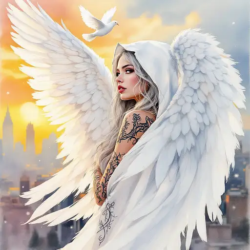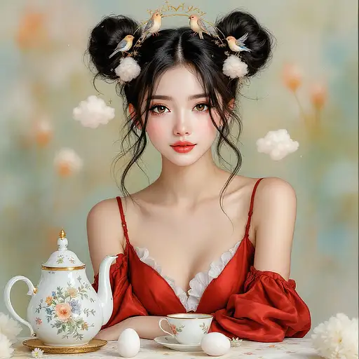 Young girl, approximately 6-8 years old, light-skinned, with long, flowing brown hair adorned with a delicate floral crown of various pastel flowers, seated outdoors in a field of golden wheat. She holds a large, ornate, red heart-shaped balloon with a string, her gaze directed off to the side. The girl's attire is a light, sky-blue, full-length dress, decorated with embroidered flowers in pinks, purples, blues, and yellows, with light, lace-like detailing around the sleeves and neckline. The dress fabric has a soft, flowing texture. A light brown wicker basket is placed in front of her. The background displays a landscape of rolling hills and fields. The colors are muted, pastel shades, with the sky a soft blue. The light source is diffused, creating a warm, gentle ambiance. The scene is filled with subtle watercolor-style brushstrokes, giving a dreamy and whimsical atmosphere. The perspective is slightly from the ground level, allowing the viewer to observe the girl in depth. A detailed rendering of flowers, a soft-focus effect, and a tranquil mood are evident. Watercolor style, dreamy, floral, childlike, peaceful. --ar 16:9 --q 2 --s 750