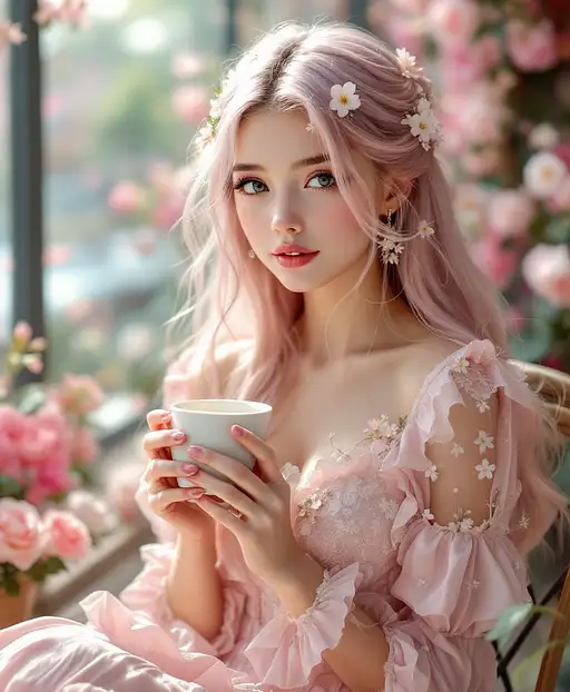 A young Asian woman , approximately 20 years old, with delicate facial features and expressive eyes, is depicted from the mid-chest up. She has a styled, elaborate hairstyle with ornate embellishments and a complex decorative headpiece. Her skin has a soft, luminous quality with subtle blush and highlights. She wears a loose, flowing, off-white robe or top, suggestive of traditional East Asian attire, with delicate, ornate patterns or embroidery on the fabric. A patterned choker is around her neck. Her hands hold a ceramic mug of light brown coffee with a latte art design. Her expression is serene and slightly thoughtful. The background is a soft, muted cream or beige tone with subtle, ethereal details reminiscent of traditional East Asian brushwork or ink wash. The lighting is soft and diffused, casting gentle shadows. The image is detailed, with a focus on soft lighting and realistic skin tones and textures. The style is realistic, painterly, and highly detailed, evocative of digital art or illustration. The composition is centered on the subject, and the overall mood is peaceful and contemplative. A close-up perspective showcases the artistry in intricate details and textures; style: realistic, detailed, cinamatic.
