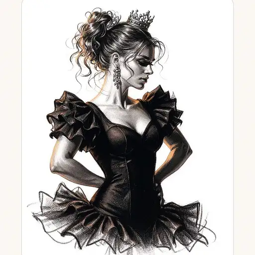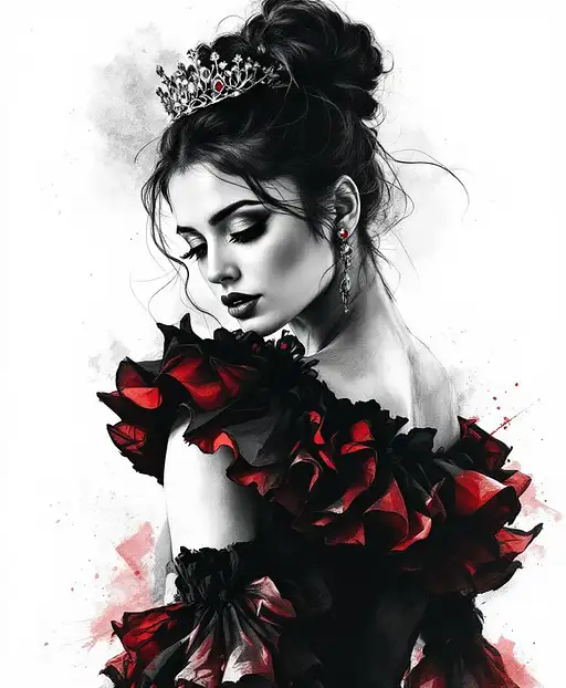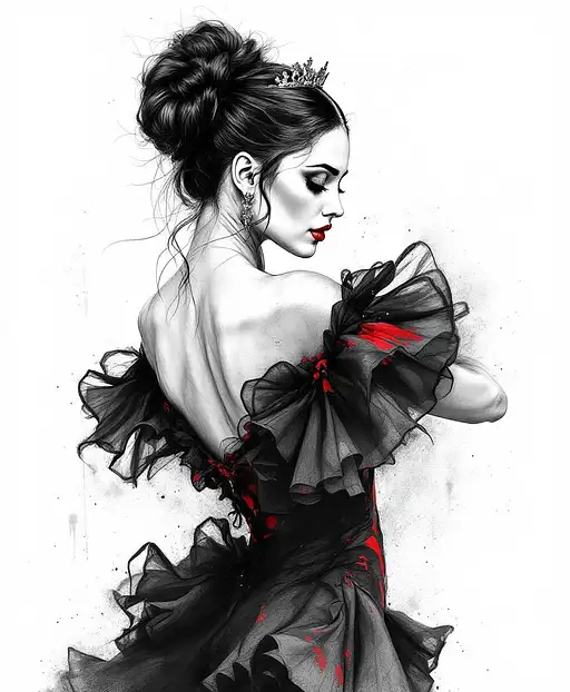 1 month ago Full-body portrait of a flamenco dancer in a classic charcoal sketch style, featuring dramatic textures and elegant details. The dancer’s hair is tied up in a voluminous bun, adorned with a small crown. Use the face of the Dama da Caixa da Escuridão. Her shoulders and arms are gracefully posed, wearing a ruffled dress with rich black and deep red tones to create depth and dimension. Emphasize the raw beauty, light and shadow play, and the traditional hand-drawn aesthetic. Ultra-detailed, realistic textures, expressive lines, soft shading --v 7.0 Morgue PRO 0 13