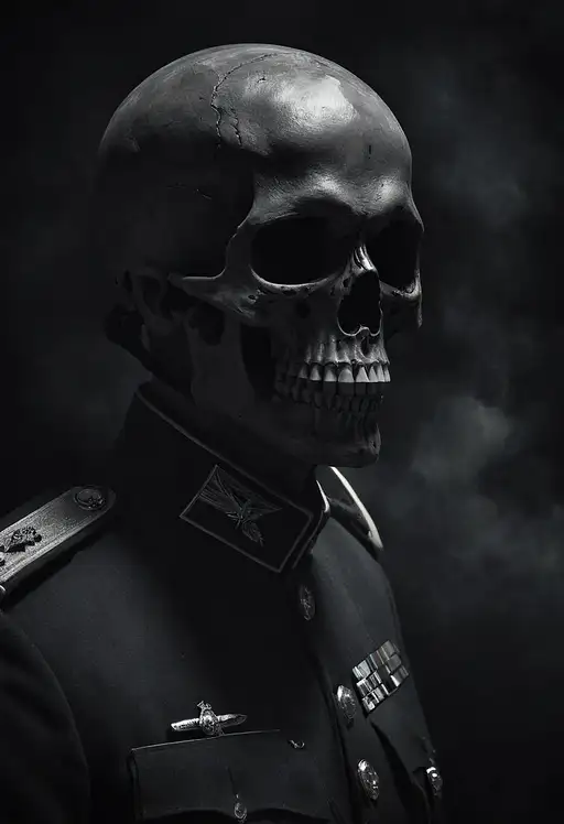 over 1 year ago A haunting, distant vista reveals a solitary dark figure shrouded in an ominous military uniform. The soldier's face is concealed behind a stark, jawless skull mask - its empty sockets and serrated teeth projecting an aura of deathly, macabre power. Only the silhouette of this grim, imposing specter is visible, devoid of distinguishing features save for the unsettling skull visage. The figure stands resolute and unwavering, radiating an overwhelming sense of grim determination and foreboding. The bleak, monochromatic palette of midnight blues and charcoal grays reinforces the soldier's ominous, foreboding presence, as if the very essence of death and decay has taken corporeal form on the distant horizon. MrHuisClos21 0 100