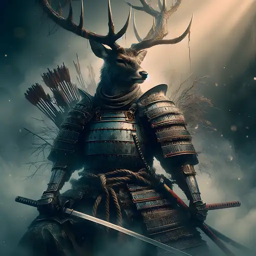 over 1 year ago Hyper realistic digital painting of a deer samurai on a battlefield, armored warrior with antlers, mystical energy, dramatic lighting, cinematic, moody, intricate details, muted color palette, gritty, grungy, atmospheric, mist and fog, art by Greg Rutkowski and Alphonse Mucha MrHuisClos21 0 62
