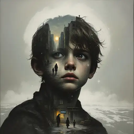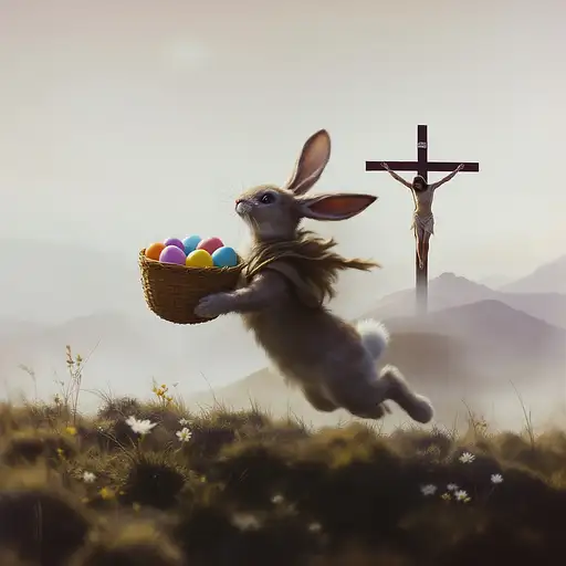 An award-winning double-exposure oil painting masterpiece that intertwines the contrasting yet connected narratives of Easter’s sacred origin and its modern-day wonder. In the foreground, the Easter Bunny is mid-hop across a hillside, a woven basket full of brightly colored eggs balanced on its back—symbols of rebirth, renewal, and joy. The bunny’s movement is light and fluid, ears bouncing, fur catching the golden edge of morning light. Within the soft, rounded form of the Easter Bunny’s silhouette unfolds the second, more solemn image: Jesus on the cross, rendered in delicate chiaroscuro within the double-exposure technique. The cross stands upon a distant hill, stark and dignified, surrounded by a quiet sky tinged with lavender and ash. The crucified Christ is not depicted in suffering, but in serene resolve—his form graceful, surrounded by an aura of light and forgiveness. The two images are not in conflict but in quiet conversation. The basket of eggs aligns with the curve of the cross, echoing themes of resurrection and sacrifice. The bunny’s ears sweep upward, blending softly into the crown of thorns. The color palette shifts gently from playful spring pastels into muted earth tones and radiant golds—conveying both celebration and reverence. The background hints at a field in transition: one half lush with blooming flowers and scattered eggs, the other fading into windswept grass and olive trees beneath a brooding sky. The brushwork is expressive and layered, giving texture to both fur and woodgrain, to joy and sorrow alike. This painting invites reflection on the dual nature of Easter—the lightness we share in its modern traditions, and the profound grace beneath them. It is a visual hymn, celebrating the circle of death and rebirth, innocence and salvation, play and purpose