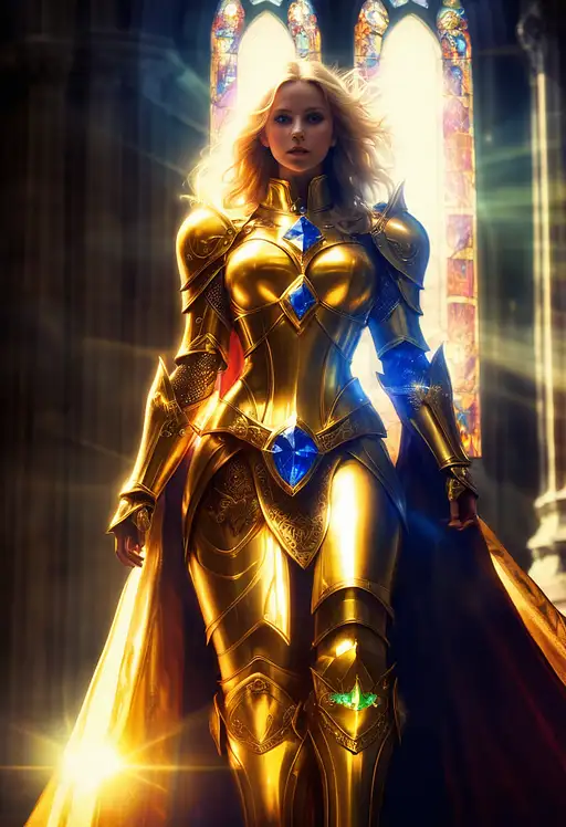 1 year ago dreamscape, epic, mystical, she wears glowing golden armor, glowing sapphire gemstones, golden sunlight, cathedral, HDR, 32k, golden blonde hair, silhouette Luv2Grill 1 110