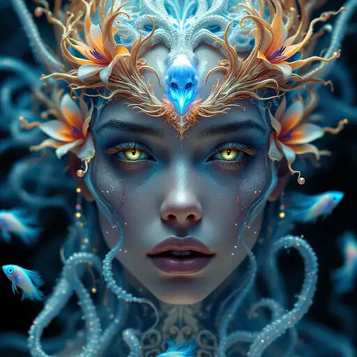 7 months ago Goddess close-up portrait ribcagel. jellyfish phoenix head, nautilus, orchid, skull, betta fish, bioluminiscent creatures, intricate artwork . octane render, trending on artstation,t symmetrical artwork. cinematic, hyper realism, high detail, octane render, 8k NwaGod 0 22