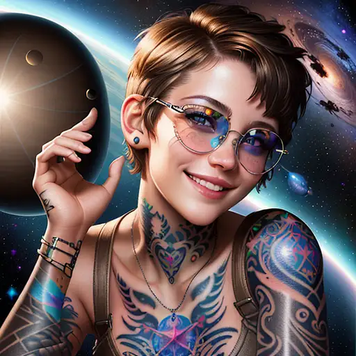 over 1 year ago ultra realistic picture of a happy young woman, short hair, badass, 8k, prinzessin, darkbrown eyes, space, fantasy, masterpice of tattoos, mit sonnenbrille Nycha 1 30