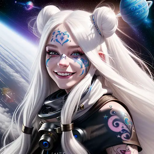 over 1 year ago ultra realistic picture of a happy young woman, long white hair, badass, 8k, prinzessin, darkbrown eyes, space, fantasy, bunte tattoos Nycha 1 25