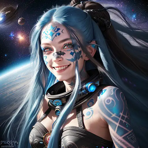 over 1 year ago ultra realistic picture of a happy young woman, long blue hair, badass, 8k, prinzessin, darkbrown eyes, space, fantasy, black tattoos Nycha 1 27