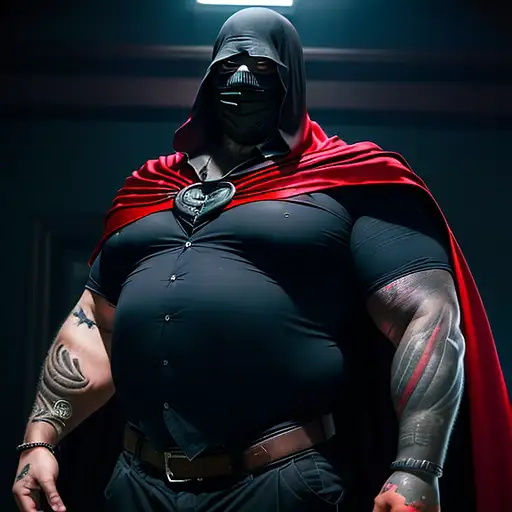over 1 year ago high quality foto of a big man, wearing a black mask, dark looking eyes, in a dark blue atmosphere, a darkred cape, tattoos Nycha 1 57