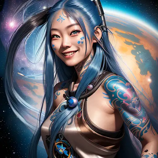 over 1 year ago ultra realistic picture of a happy young asian woman, long blue hair, badass, 8k, prinzessin, darkbrown eyes, space, fantasy, masterpice of tattoos, Nycha 1 24