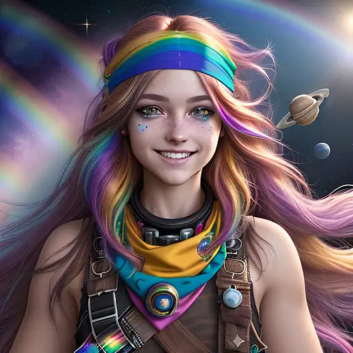 over 1 year ago ultra realistic picture of a young happy woman, long rainbow hair, badass, 8k, prinzessin, darkbrown eyes, space, fantasy, wearing a bandana Nycha 1 36