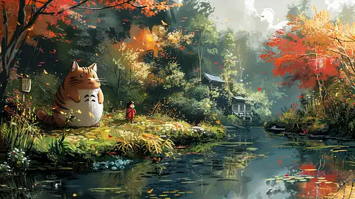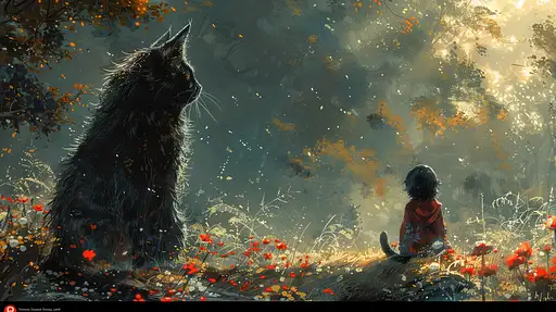 1 year ago A Ghibli-inspired scene with a playful cat -- loyal dog -- child protagonist exploring a magical forest -- soft pastel palette -- vibrant greens -- warm earth tones -- whimsical realism -- rounded soft edges -- organic forms -- hand-painted look -- watercolor effects -- flowing expressive linework -- balanced composition -- depth through layering -- enchanted slice-of-life scene -- Studio Ghibli style --v 6 --ar 16:9 --s 600 --q 2 --style raw --c 20 --chaos 10 OHUNE 0 33