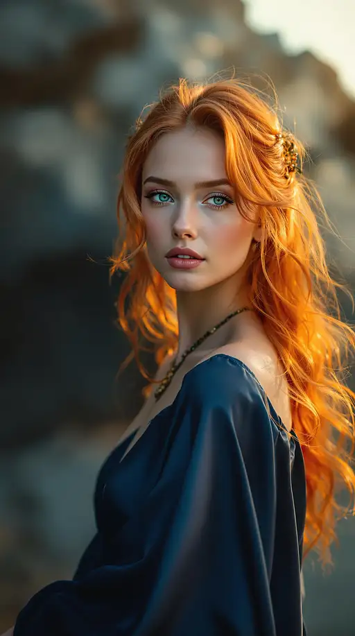2 months ago “Professional fine art photography full body vertical portrait, cinematic style, warm golden hour light, soft pastel colours. Copper red hair and Imperial full length deep blue silk dress flowing upward, creating an ethereal atmosphere. Green blue silver grey eyes contrast with the reds. Deep shadows, soft highlights, dreamy haze. Vertical composition, emphasising graceful movement. Soft contrast, soft saturation.” PY2K66 PRO 0 15