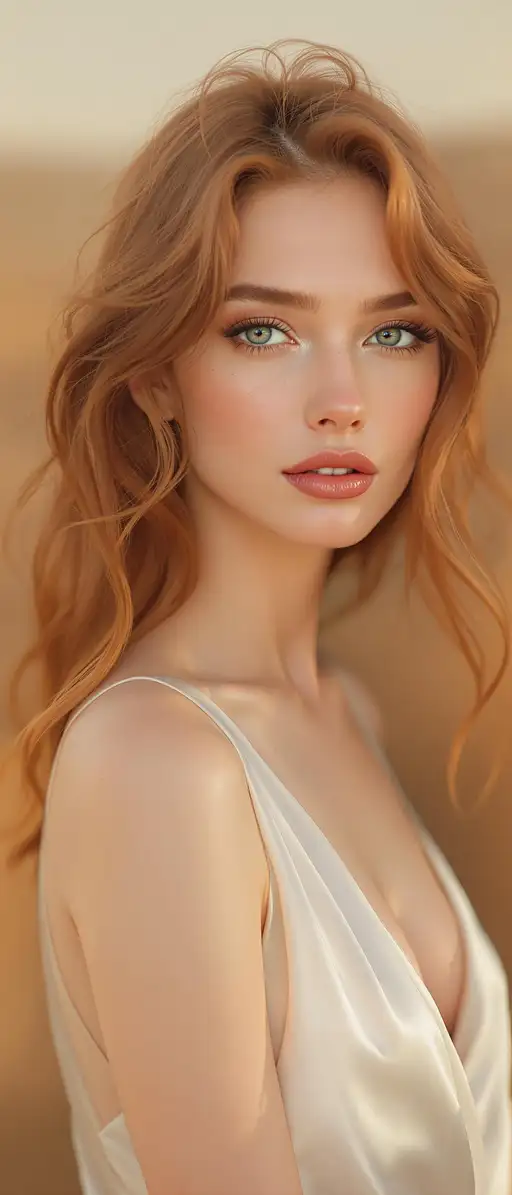 2 months ago "Professional full body image portrait photography, warm golden hour lighting. A stylish supermodel, early twenties, light skin, copper red hair, expressive large eyes are a unique blend of emerald, blue, grey. full lips and defined cheekbones. luxurious white silk dress. background subtle earth tones, soft pastel colours, tranquil expression." PY2K66 PRO 0 18