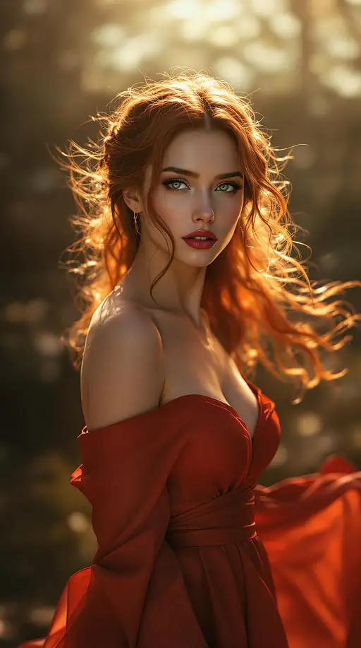 2 months ago “Professional fine art photography full body vertical portrait, cinematic style, warm golden hour light, soft pastel colours. Copper red hair and Imperial full length red silk dress flowing upward, creating an ethereal atmosphere. Green blue silver grey eyes contrast with the reds. Deep shadows, soft highlights, dreamy haze. Vertical composition, emphasising graceful movement. Soft contrast, soft saturation.” PY2K66 PRO 1 27