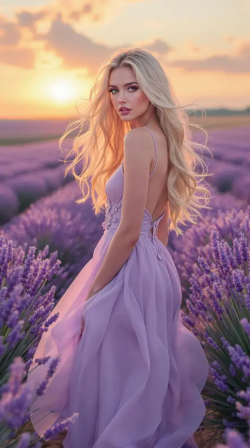 2 months ago "Fine art full hight, body image photograph, warm golden hour light, soft pastel colours, dramatic cinematic style, supermodel with fair skin and long flowing golden blonde hair in a lavender gown, standing gracefully in a symmetrical lavender field, sunset sky, soft clouds, visually striking composition." PY2K66 PRO 0 28
