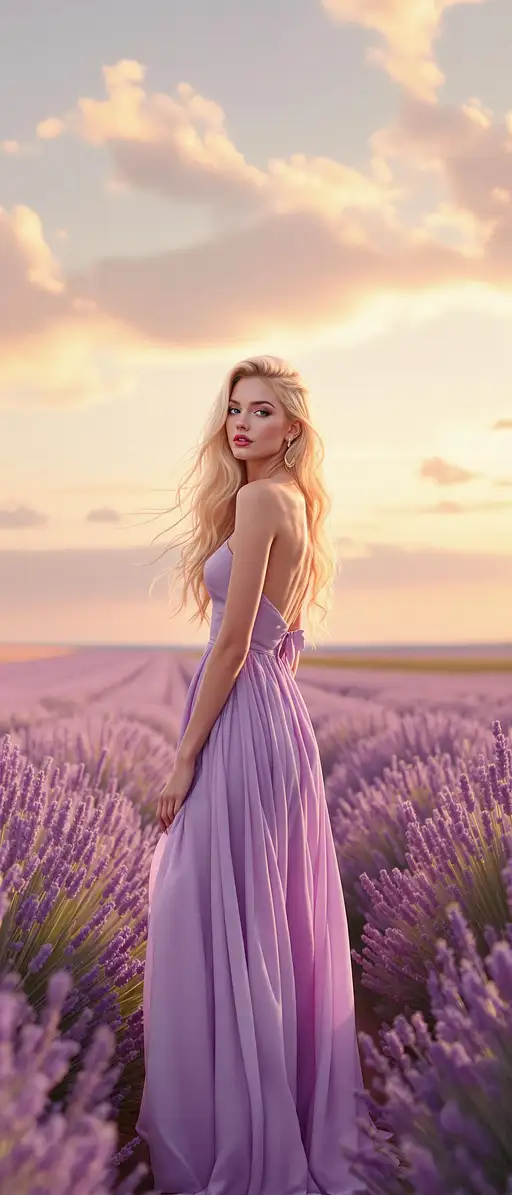 2 months ago "Fine art full hight, body image photograph, warm golden hour light, soft pastel colours, dramatic cinematic style, supermodel with fair skin and long flowing golden blonde hair in a lavender gown, standing gracefully in a symmetrical lavender field, sunset sky, soft clouds, visually striking composition." PY2K66 PRO 0 24