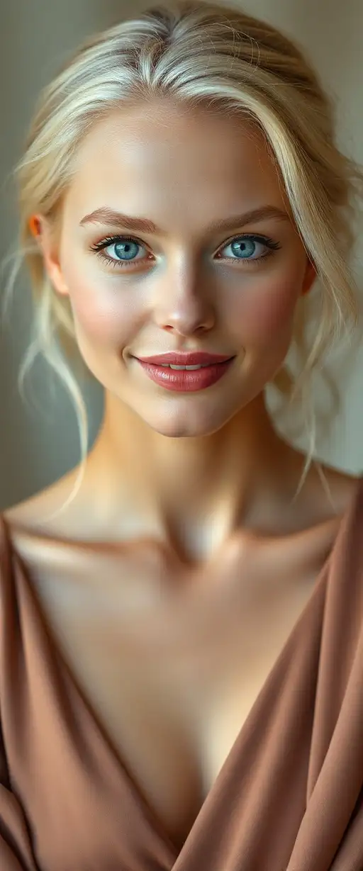 4 months ago "Professional fine art photography, soft light, warm tones. Lithe slender supermodel, early 20s, fair skin, platinum blonde hair, captivating vibrant blue-silver grey eyes. Full pink smiling lips Delicate features, smooth complexion. Muted-coloured draped garment. Bokeh background. Elegant and refined, soft contrast and saturation." PY2K66 PRO 0 12