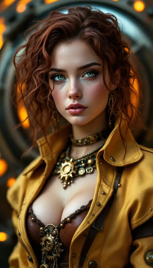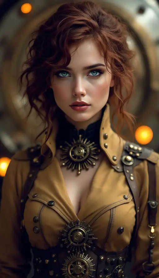 6 months ago "Image is a highly detailed, stylised portrait of a 22 year old woman, Captain Nemo's daughter Victorious, Captain of Nautilus fame in a steampunk setting. She has fair skin, striking green eyes, and dark auburn tousled wavy hair cascading around her face. Her expression is intense and focused. She is wearing a champagne yellow and brown steampunk outfit adorned with intricate brass gears and embellishments, including a prominent gear-shaped broach on her chest. The background features blurred, circular metallic elements with glowing orange accents, enhancing the steampunk aesthetic. The lighting highlights her facial features and the metallic details of her attire, creating a dramatic and immersive atmosphere." PY2K66 PRO 0 11