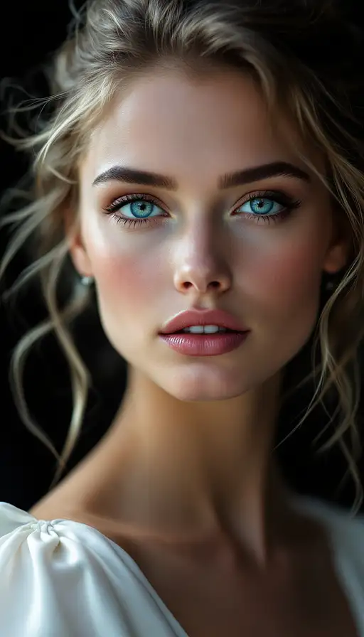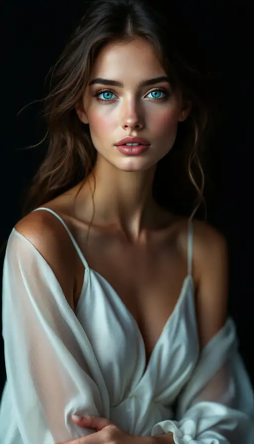 6 months ago "A captivating high-resolution portrait captured with a Sony A1 50.1 MB camera through a 75mm prime lens, showcasing a stunning British model in her mid-20s. Her striking, sparkling blue eyes hold a sharp gaze that tells a story of elegance and vulnerability. With refined features highlighted against a deep black background, she elegantly poses in a light, flowing white silk dress that dances subtly under soft light. The image features gentle contrast and a touch of saturation, enhancing the ethereal quality of the scene, drawing viewers into the model's captivating world." PY2K66 PRO 0 28