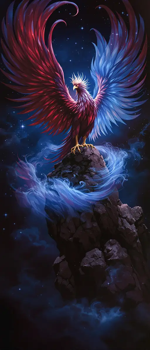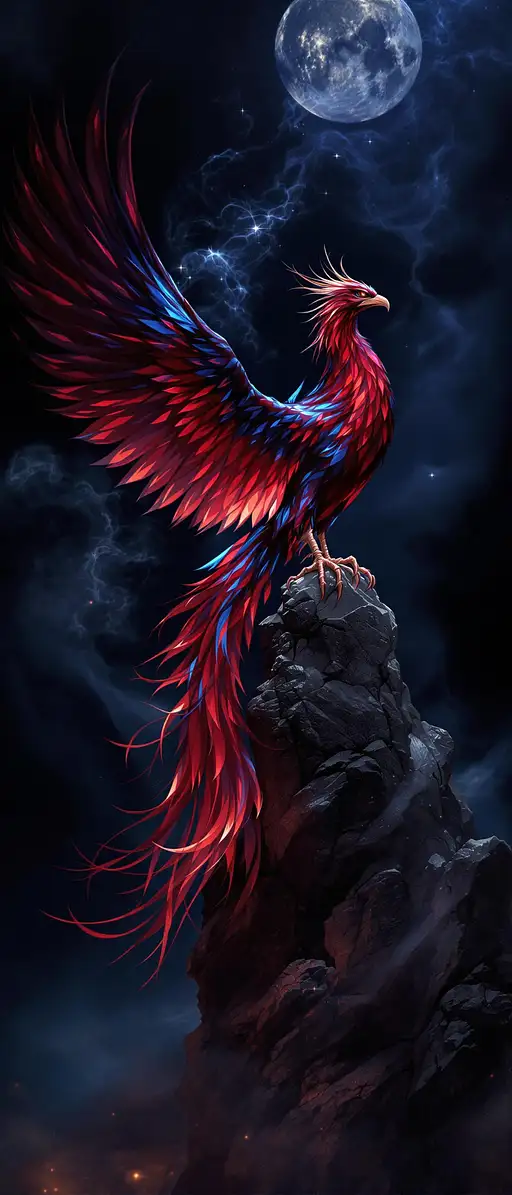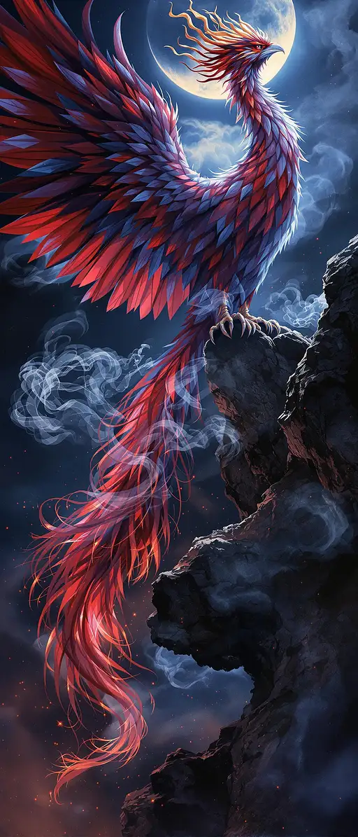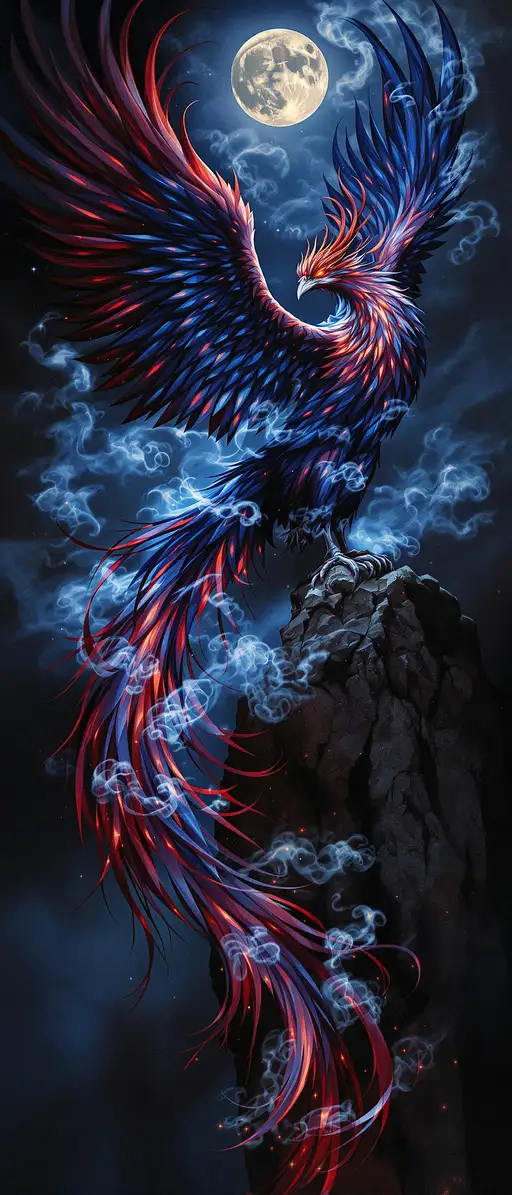 6 months ago "A majestic Phoenix rendered in rich burgundy and deep blue, its feathers shimmering like an opal under moonlight. Chiaroscuro lighting emphasises the graceful curves of its wings, casting strong contrasts and deep shadows that make the mythical bird appear both mysterious and powerful. Sophisticated and elegant in style, it perches atop a craggy cliff, surrounded by a swirling mist that dances gracefully around its fiery talons, creating an ethereal atmosphere. The scene is reminiscent of a gothic painting, full of enigma and grandeur." PY2K66 PRO 0 27