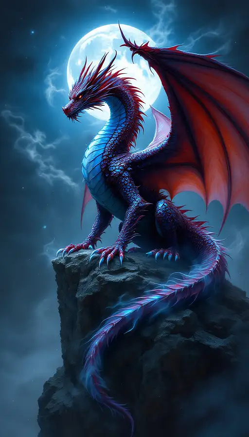 6 months ago "A majestic dragon rendered in rich burgundy and deep blue, its feathers shimmering like an opal under moonlight. Chiaroscuro lighting emphasises the graceful curves of its wings, casting strong contrasts and deep shadows that make the mythical dragon appear both mysterious and powerful. Sophisticated and elegant in style, it sits atop a craggy cliff, surrounded by a swirling mist that dances gracefully around its fiery talons, creating an ethereal atmosphere. The scene is reminiscent of a gothic painting, full of enigma and grandeur." PY2K66 PRO 0 27
