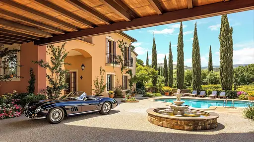 "A breathtaking villa surrounded by rolling hills, olive groves, and vineyards bathed in golden sunlight in Tuscany. The villa is a traditional Italian farmhouse with warm terracotta walls, rustic wooden beams, and large arched windows. A gravel driveway leads to a beautiful courtyard with a stone fountain. A vintage classic silver grey Aston Martin convertible sports car is parked. Lush greenery, tall cypress trees, and vibrant lavender bushes frame the landscape. A happy couple, stylish and relaxed, enjoys an outdoor breakfast on a wooden table under a pergola, draped in vines, while their two young children play on the lawn. In the distance, a blue swimming pool glisten. DJ decks with turntables and speakers are set up for an evening of music and romance under the stars. The atmosphere is serene, elegant, and effortlessly luxurious, capturing the essence of a dream life in the Italian country side."
