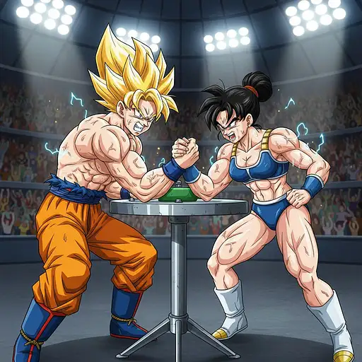 12 days ago Dragonball z anime style: A shirtless base form Goku and a muscular Chichi wearing blue workout clothes are engaging in an intense armwrestling match. Their elbows firmly placed on top of an armwrestling table inside a closed venue. Petershotdog 0 11