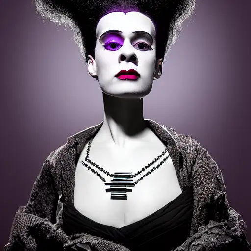 almost 3 years ago a vibrant professional studio portrait photography of bride of frankenstein, white hairs, goth, attractive, friendly, casual, delightful, intricate, gorgeous, female, piercing purple eyes, wears a silver necklace, femme fatale, nouveau, curated collection, annie leibovitz, nikon, award winning, breathtaking, groundbreaking, superb, outstanding, lensculture portrait awards, photoshopped, dramatic lighting, 8 k, hi res Pixometry 0 91